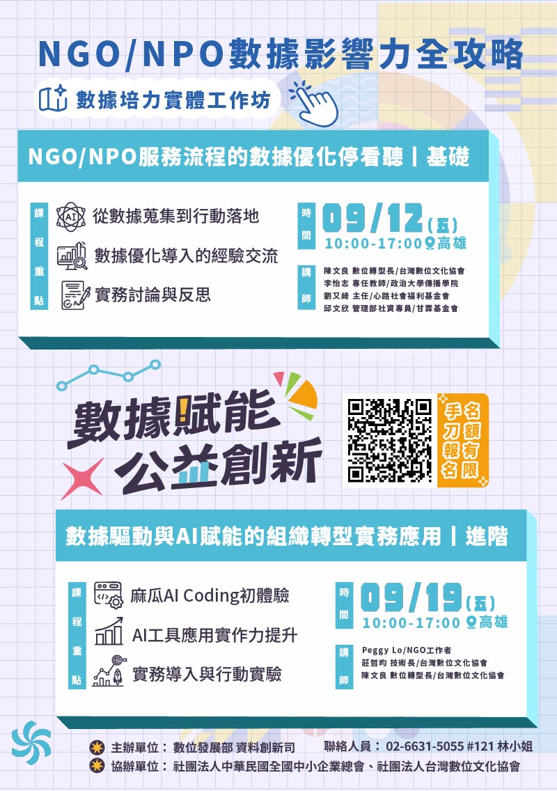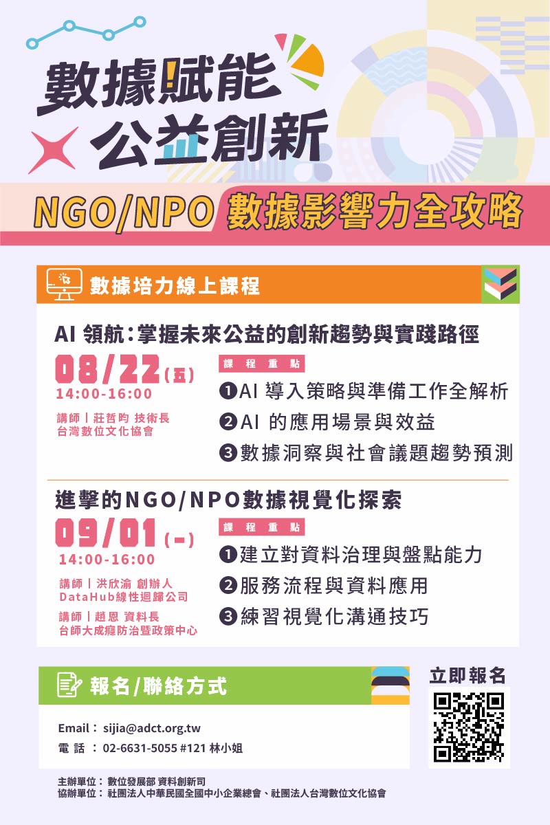 數發部為推動國內NGO/NPO組織活用數據並驅動發展公益創 新服務,於114年8月起至115年11月止,陸續開設線上數據 培力課程、實體技術工作坊及數據創新應用輔導,協助民 間組織提升數據素養及技術應用知能,進而使組織服務流 程優化、營運決策效能提升,擴散公益社會影響力。